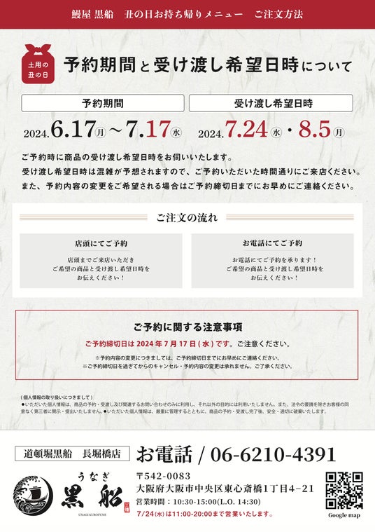 長堀橋店(土用の丑の日WEEK)営業時間の案内