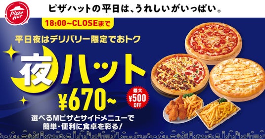 もう1つの新バリューである「夜ハット」では、デリバリー限定で8種のMサイズピザが最大500円OFFで食べられて、かつ5種のサイドメニューが150円OFFでご注文可能。