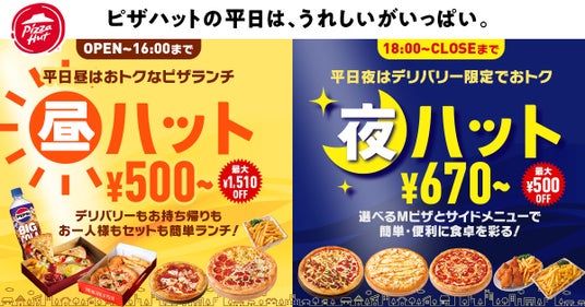 そして今回、ピザハットをより身近なものに感じていただくため、「昼ハット」「夜ハット」という2つの新バリューを2024年7月16日(火)より平日・オンライン限定で開始いたしました。時間帯によっておトクになる様々なメニューをご用意、おトク感を楽しみつつ、時間帯によって選ぶメニューを変えるという新しい楽しみ方もしていただけます!