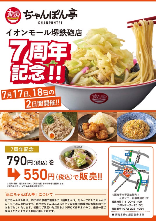 7月17日(水)と7月18日(木)の2日間に限り、近江ちゃんぽん(野菜小)を感謝価格の550円(税込)でご提供いたします!(通常価格790円)