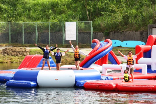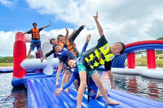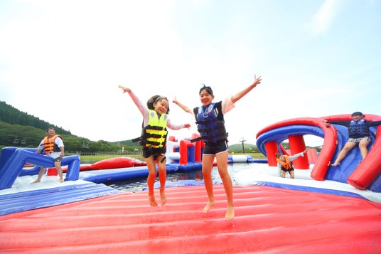 水上アスレチックには、トランポリンやすべり台などのアイテムが搭載されており、ふわふわと浮かぶ遊具の上を跳ねたり滑ったりと、お子さまから大人まで楽しめるスリル満点のアトラクションです。