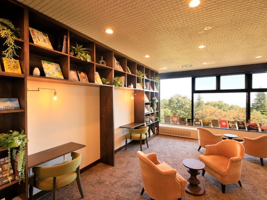 グリーンが映える設えのライブラリーは眺望も抜群。読み書きできるデスクには電源もあるのでワ―ケーションにも最適です。