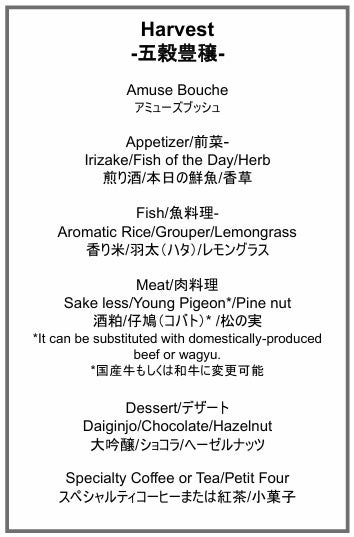 ディナープログラム『Harvest(ハーヴェスト) -五穀豊穣-』は、収穫したばかりの新米を使用して、酒蔵が新酒の仕込みを始める秋にふさわしい「日本酒」をテーマにした新感覚のプログラムです。貴醸酒や大吟醸など贅沢な日本酒が新鮮な食材の風味を惹き立てる、収穫を祝い大地に感謝するこの季節ならではのメニューに仕上がりました。