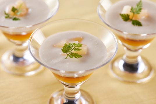 梨のヴィシソワーズスープとコンソメジュレのパリソワール風