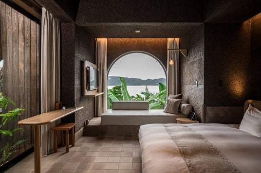 今回の新しいキャビンでは、コルクの壁が奄美のざわめく風の音や波の音を吸収するため、室内には静寂が広がります。サファイヤのような静かな海を室内から眺め、一歩バルコニーへ出ると、突然大きな波の音に包まれます。既存棟とは異なる海との繋がり方を実現したキャビンです。