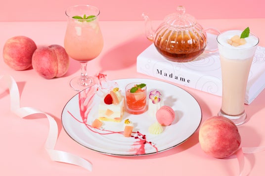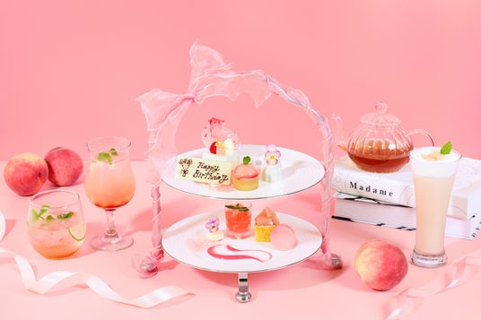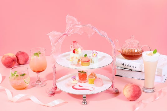 「桃のアフタヌーンティースタンド」3,900円 ※完全予約制 / 「桃のアフタヌーンティープ