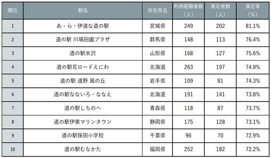 インターネット調査/スクリーニング調査で全国8エリアそれぞれ満足度トップ10にランクインした計81施設を選択肢として設定。過去3年以内(2021年4月~2024年3月)に行ったことがある施設の中から「満足した、良かった」施設を3つまで選択。利用経験者数が80人以上の施設を対象に集計。調査期間:2024年4月15日(月)~2024年4月22日(月)/調査対象:47都道府県在住 20代~50代男女/有効回答数:4,221人/駅名は全国道の駅連絡会HPの記載に準じる