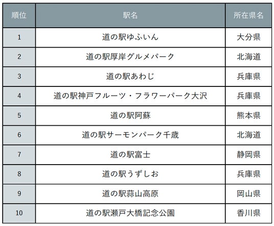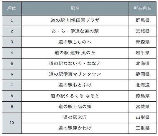※2025年3月28日追記 ランキング間違いがございました。6位「道の駅新潟ふるさと村」が対象外となり、「道の駅米沢」「道の駅津かわげ」がランクインしております。