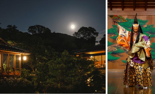 初めにパーク ハイアット 京都の宴会場「木洩陽(KOMOREBI)」にて、京大和の料理長 中島光雄(なかじま みつお)とパーク ハイアット 京都の総料理長 井料剛(いりょう つよし)が厳選した旬の食材でご用意する和洋折衷のコース料理を芸舞妓の舞をご覧いただきながらご堪能ください。その後は「山荘 京大和」の保存庭園にて、琴の演奏を聴きながら、和菓子とお抹茶でお月見をお楽しみください。美しい秋の夜のハイライトとして歴史的建築物「翠紅館」を舞台に、観世流シテ方河村浩太郎(かわむら こうたろう)氏をお招きし、半能「屋島」をご覧いただきます。「屋島」は平家物語を基に作られた曲で世阿弥作と言われています。月明かりの下、青年義経が颯爽と勝ち戦の様子を語って聞かせるめでたい曲として江戸時代に数多く上演されたものです。中秋の名月の下、古の昔を想像しながら、京都随一の展望を誇る絶好のロケーションで幻想的な能の舞をお楽しみください。