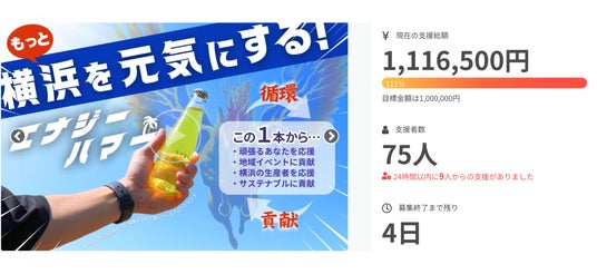 株式会社エリアプロジェクト(本社:神奈川県横浜市都筑区、代表取締役社長:小杉駿介)は、横浜発のエナジークラフトドリンク「エナジーハマー」のクラウドファンディングプロジェクトが、7月17日時点で目標金額の111%にあたる1,116,500円を75名の支援者から集め、目標額の100万円を達成したことを発表いたします。