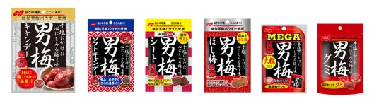 「男梅」はこだわり抜いた塩味と梅の旨味をとことん追求し、秘伝の男梅パウダーで唯一無二の梅干しの味わいを楽しめるノーベル製菓のロングセラー商品です。発売以来、キャンデーやグミ、シート、ソフトキャンデーなどラインナップを拡充し、幅広い世代の方から好評をいただいています。