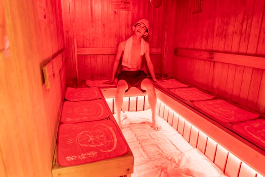 男梅サウナでは、梅の香り漂うスチームサウナ(上)と、真っ赤なライトに染まった、熱気溢れるドライサウナ(下)の2種類を体験いただけます!「梅感」を味わったあとにはスカイツリーの見えるウッドデッキで外気浴をお楽しみください。