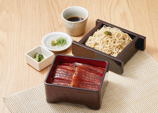 うなぎを2枚乗せた豪華なうな重。セットの麺はそば又はうどん(温・冷)がお選びいただけます。