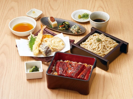 ふんわりと焼き上げたうなぎと揚げたての天ぷら盛り合わせ、そば、三種の惣菜がついた御膳。