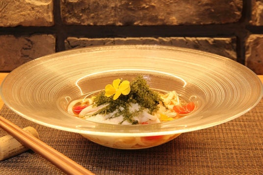冷たくしめた麺にとろろ、海ブドウ、刻みのりをトッピングし、飾り付けを華やかにするためにエディブルフラワーをプラス。