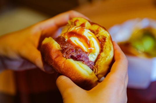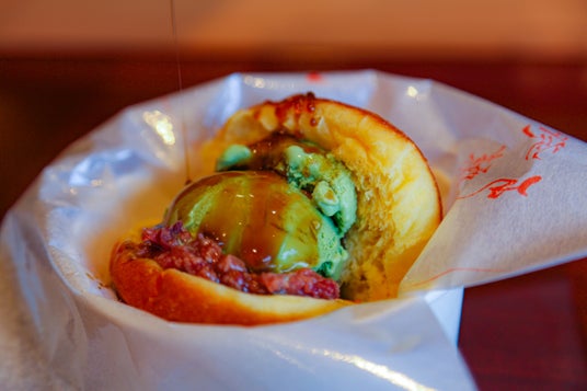 お店で揚げたてのドーナツ生地、砂糖不使用の発酵あんこに、アイスをはさんだ発酵あんドの揚げアイス。さらに黒蜜をかけて、贅沢な味わいがお楽しみ頂けます。中のアイスはバニラと抹茶の2種類でご用意。