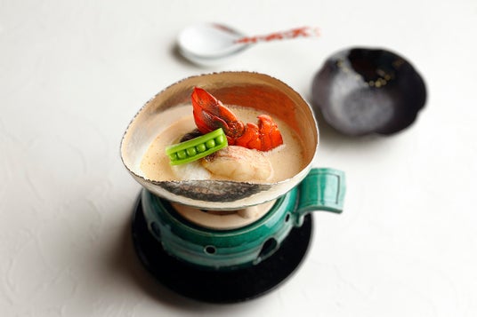 栄螺つぼ焼 合鴨コンフィー昆布茶仕立て