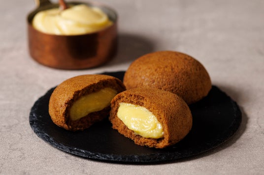 なめらかなカスタードクリームを、ふんわり食感のカラメル風味スポンジでやさしく包み込んだ蒸しケーキ。