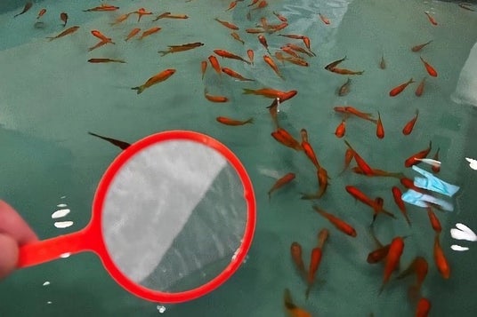 1ポイ300円の金魚すくいは大人気 金魚はリリースいただき、すくった数に応じて景品と交換します