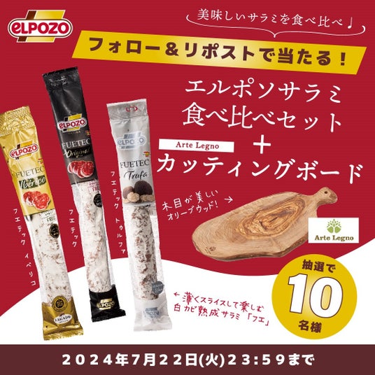 スペインのサラミソーセージ「エルポソ」は、2024年7月18日(木)10:00~7月22日(月)23:59の期間中、X(旧Twitter)にてフォロー&リポストキャンペーンを開催いたします。当選者の10名様にはエルポソのフエとカッティングボードをセットにしてお届けする予定です。