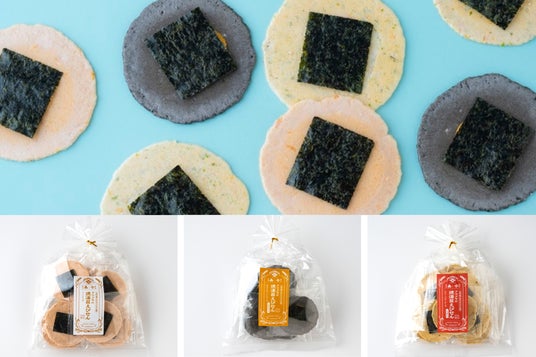 左から)えびせん×うにチーズ、イカスミ入りえびせん×あおさ入りうにチーズ、しらす入りえびせん×たらこバターチーズ