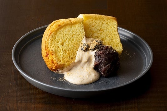 AKOMEYA食堂 神楽坂では、米粉フェアに合わせた限定メニューをご提供します。国産の卵と米粉を使用し、素材のおいしさを最大限に活かした、しっとりふわふわのシフォンケーキに香ばしいきな粉クリームと小倉あんを添えました。