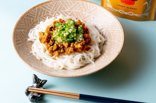 おこめんと米粉のカレーフレークを使った、米粉の「キーマカレー麺」のレシピをご紹介。