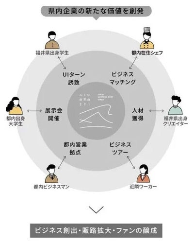 ふくい南青山291では福井と都市圏の人たちが集う飲食スペースとワークスペースを併設。学生や社会人などさまざまな利用者が同じ空間でフラットに交流し、異なる特性を活かしたコラボレーションが生まれるような空間設計を行っています。さらに、交流を喚起するためのファリシテーションも提供しており、ハード・ソフトの両面から多種多様なイノベーションの誘発をサポートしていきます。