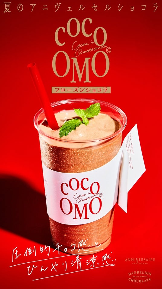 ゲストハウスウェディングを中心に、様々な記念日プロデュース事業を展開するアニヴェルセル株式会社は、「アニヴェルセルカフェ 表参道」にて、ANNIVERSAIRE SUMMER 2024を開催。第三弾は、2024年7月20日(土)から9月11日(水)までの期間限定でサンフランシスコ発のBean to Bar*のチョコレート専門店「ダンデライオン・チョコレート」とのコラボレーションによるテイクアウトドリンク 「COCO OMO (ココ オモ) フローズンショコラ」を販売いたします。爽やかなフローズンドリンクで芳醇なカカオを味わいながら、表参道で過ごす夏のひとときをお楽しみください。