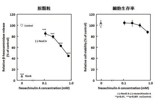 ネオエキヌリンAの脱顆粒抑制効果 :ネオエキヌリンAは細胞毒性を示すことなく脱顆粒を有意に抑制した