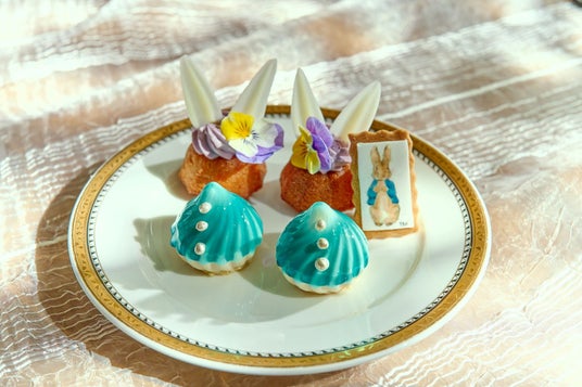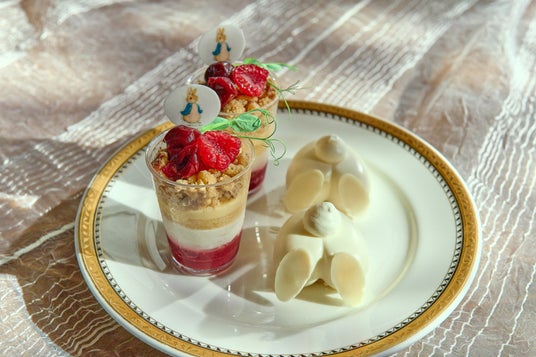 スイーツは、ピーターラビットの象徴的なブルージャケットをイメージしたアールグレイが香るチョコレートムースや、グリオットチェリーとイチゴのソースなどを5層に重ねたイギリス伝統菓子のトライフル、愛らしいうさぎの後ろ姿のライチムース、さっぱりと仕上げたオレンジとにんじんのガトーオペラ、ピーターの妹たちが摘んだベリーをたっぷりのせたバスケットタルト、うさぎに見立てたフィナンシェ、ピーターのスタンプクッキーの7種をご提供。特製セイボリーには、イギリスの定番料理のエッグヴェネディクトやフィッシュ&チップス、ビーツとカブのポタージュスープなど4種をご堪能いただけます。
