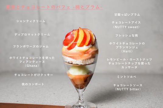 ジューシーな桃とチョコレートの相性を楽しみながら、移り変わる味わいを堪能する桃パフェ