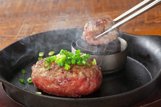スタッフが手ごねで仕上げたハンバーグは表面のみ焼き色を付け、中は生の状態でお客さまに提供。鉄板皿の上に乗った焼き石を使い、ハンバーグを一口サイズに切り分け、赤身がなくなるまでお客様ご自身で焼いていただきます。