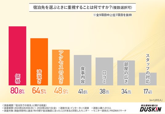 ・宿泊先選びは、約8割は「価格」、約6割は「清潔さ」を重視。