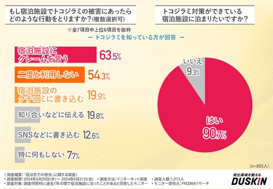 もし宿泊施設でトコジラミの被害に遭った場合、どのような行動を取るか質問したところ、『宿泊施設にクレームを言う(63.5%)』と回答した方が最も多く、次いで『二度と利用しない(54.3%)』『宿泊施設のクチコミに書き込む(19.9%)』と続きました。そして最後に、トコジラミ対策ができている宿泊施設に泊まりたいか質問したところ、約9割の方が『はい(90.7%)』と回答しました。