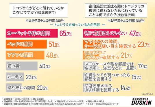 ・トコジラミの隠れ場所は「カーペットや床の隙間」「ベッドの隙間」など、8割以上が「知っている」と回答。