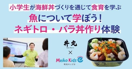 個別指導の学習塾「明光義塾」を全国展開する株式会社明光ネットワークジャパン(本社:東京都新宿区、代表取締役社長:山下一仁)が展開するオールイングリッシュの学童保育・アフタースクール、Meiko Kids e(明光キッズe)は、海鮮丼テイクアウト専門店「丼丸」を全国展開する株式会社ササフネ(本社:東京都葛飾区、代表取締役:亀山 政典)と小学生向け魚×食育イベント「魚について学ぼう!ネギトロ・バラ丼作り体験」を8月3日(土)11時より開催します。本イベントでは、夏休み中の小学生が海鮮丼づくり体験を通じて魚への理解を深め、食材の大切さや食の楽しさを体験することで、食育を学びます。