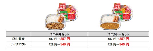 吉野家のお子様メニューは「ミニ牛丼セット」と「ミニカレーセット」の2種類をご用意しています。「ミニ牛丼セット」と「ミニカレーセット」も『お子様割』の対象商品です。牛丼、カレーの主食に加えて副菜としてお子様に人気のウインナーを追加しました。また、お子様が自分で食べるという楽しさを感じてもらうために、ケチャップやふりかけを付けました。白をベースにかわいい動物たちをデザインした容器にはその他に、ジュース、ゼリーも付いています。