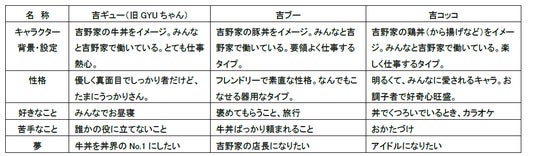 吉野家の公式キャラクターを務める「ドンどん丼ぶりーズ」は、どんどん食べてほしいという想いから名付けました。吉ギュー、吉ブー、吉コッコそれぞれのプロフィールを紹介します。