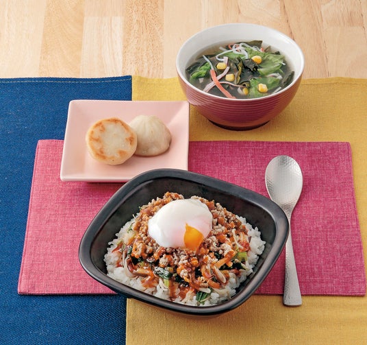 韓国の定番料理、ビビンバをご家庭で。包丁いらずで流水解凍してご飯にのせるだけです。