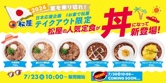 レジャーやスポーツ観戦の増える2024年の夏。夏を乗り切るための日本応援企画として、テイクアウト限定で松屋の人気定食を丼で提供いたします。創業当初から大人気、ロングセラーの「牛焼肉」、長年多くのお客様よりご愛顧いただいている、柔らかくジューシーなお肉の「カルビ焼肉」、豚肉の脂の旨味と鉄板でジューシーに焼き上げた香ばしい風味が特徴の「豚カルビ焼肉」、合い挽き肉のハンバーグをふっくら焼き上げ、マッシュルームの香りと旨味が広がる濃厚なブラウンソースをたっぷりかけた「ブラウンソースハンバーグ」を丼としてご提供いたします。また、「ブラウンソースハンバーグ」だけでなく、目玉焼きやチーズトッピングで幸福度も高い「ブラウンソースエッグハンバーグ」「ブラウンソースチーズハンバーグ」も丼としてご提供。さらに、7月30日(火)より全国販売が決定しているシークレットな丼も登場します。この機会にぜひ、ご賞味ください。