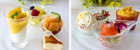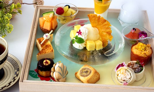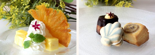アシェットデセール(レモンソルベとパイナップルチップス)/ 季節のフルーツタルト / バナナスコーン / マンゴープリン / シェルマカロン / チョコカヌレ / 焼きチーズケーキ / フレッシュフルーツポンチ/パッションフルーツかき氷