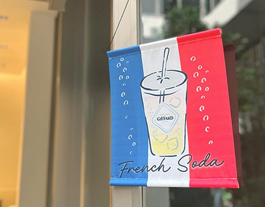 ジファールシロップを使用してフレンチソーダを展開される飲食店様向けに、特製タペストリーをプレゼント。目を惹くトリコロールカラーと夏らしい雰囲気で集客にご活用いただけます。
