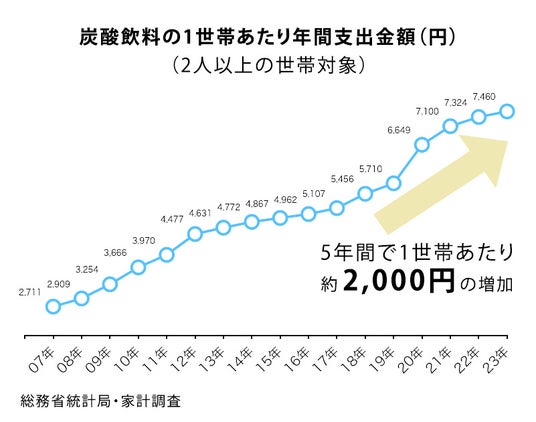 炭酸飲料の家計消費支出は年々増加しており、過去最高の7,460円に達した2023年と2018年を比較すると約2,000円増加しています。