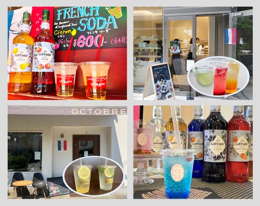 フレンチソーダ採用事例(左上から時計回りに):VIRON 渋谷店、PAYSAGE by Hideki Eto(代官山)、パティスリー結(愛知県・日進市)、PATISSERIE OCTOBRE(三軒茶屋)