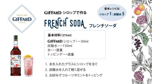 ジファールは、このフランスの文化を取り入れたフランス産シロップと炭酸水で作るドリンクを「フレンチソーダ」と称し、パティスリーやカフェを中心に提案しています。