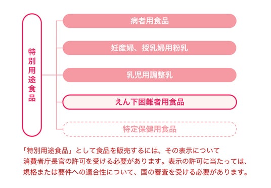 「えん下困難者用食品」は特別用途食品のひとつであり、飲み込みに不安のある方や食事中のむせ(誤嚥)が気になる方等を対象に、えん下を容易にし、誤嚥や窒息を防ぐために硬さ等を調整した食品です。