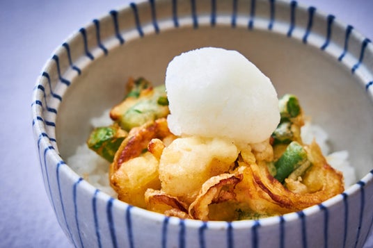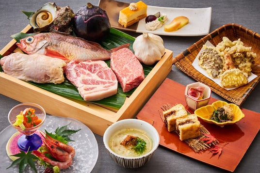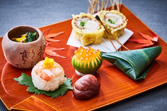 新潟県・長野県産の恵みをさまざまな調理方法でご堪能いただける、ランチ限定のメニューです。先付では、長野県が生産量日本一のきのこをふんだんに入れ、味噌と合わせてパイ包みにして焼き上げました。パイ生地のサクサクとした食感と具材の旨味、香りの広がりをお楽しみいただける一品です。焼物は、脂が少なくさっぱりとした味わいが特徴の旬の“ワラサ”を、しば漬けの程よい酸味をアクセントにお召し上がりいただけます。食事では、噛むほどに甘みを感じられる新潟県産の“南蛮海老”と野菜を一緒に揚げたかき揚げ丼をご堪能ください。締めくくりには、長野県産のぶどうの味をしっかり感じられるムースと、新潟県産のりんごのコンポートで旬の味をお楽しみください。