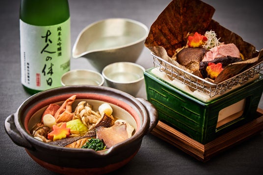 秋を感じる先付、前菜から始まり、お椀は夏よりも脂が乗っていて濃厚な味わいの“名残り鱧”の土瓶蒸しをご用意いたします。長野県のオリジナルブランド鶏“信州福味鶏”や、コリコリとした歯ごたえが特徴の長野県産“あわび茸”などと一緒にお召し上がりください。造りでは、脂がのっているのにしつこくなく、トロリととろける舌触りが特徴の“信州サーモン”と、噛むほどに甘みが増す新潟県産の“南蛮海老”、海藻のいご草を溶かして冷やし固めた新潟県の郷土料理“いごねり”をご堪能ください。強肴では、信州の壮大な山々が育んだ水と、豊かな自然環境のなか生産された“長野県産和牛”を、ねぎやしょうがなどの薬味や“信州きのこ”と味噌に混ぜ、朴葉に乗せて焼いた朴葉味噌焼きをお楽しみいただけます。甘辛い味噌がお酒ともよく合う一品です。他にも、新潟県産の椎茸の揚物や枝豆とチーズの春巻き、信州そばなど、始まりから終わりまで随所に新潟県と長野県の素材を感じていただける会席です。