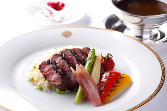 素材にこだわった“紀州和華牛”のサーロインをお客さまの目の前でフランベし、夏野菜と鶏の出汁で炊いたガーリックライスを盛り合わせた相性抜群の一品です。贅沢な演出と味わいを是非ご堪能ください。